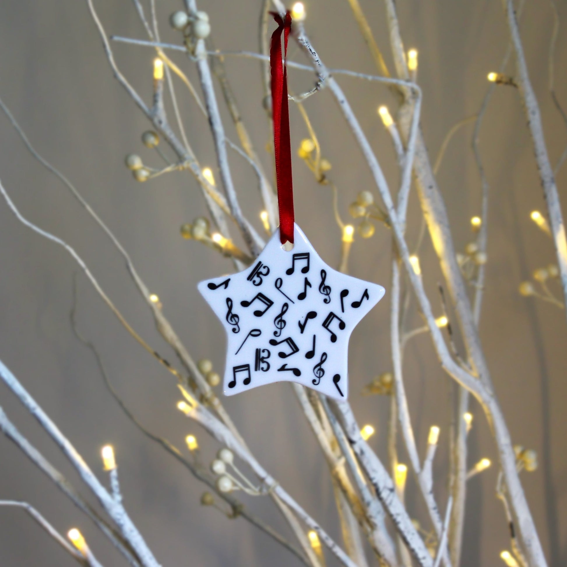 This Christmas, add some musical festive cheer to your home with this unique handmade tree decoration! In smooth white ceramic complete with red ribbon, this star features music notes and symbols. A perfect gift for a music lover or a treat for yourself, this Christmas!